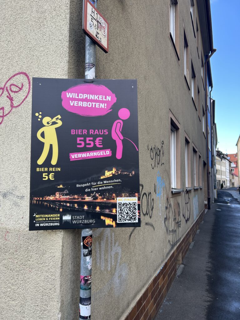 Unsere Nachtmediator:innen sind an den Wochenenden in der Würzburger Innenstadt unterwegs und erleben die Situation immer wieder aus nächster Nähe: Menschen pinkeln in Seitengassen, an Hauswände und Straßenecken – teilweise sogar in Hauseingänge oder auf Fahrräder.